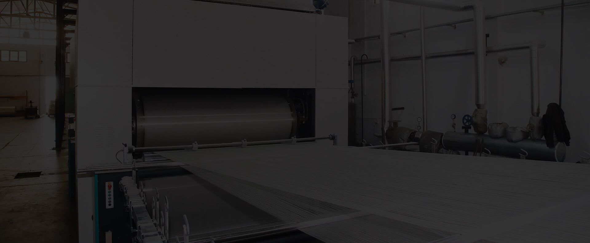 当社生産ラインの入り口です。投稿上での生産は、このラインの糸のボビンから始まります。この生産工程では、糸がサイジングの前に準備され、ビームに巻き付けられます。