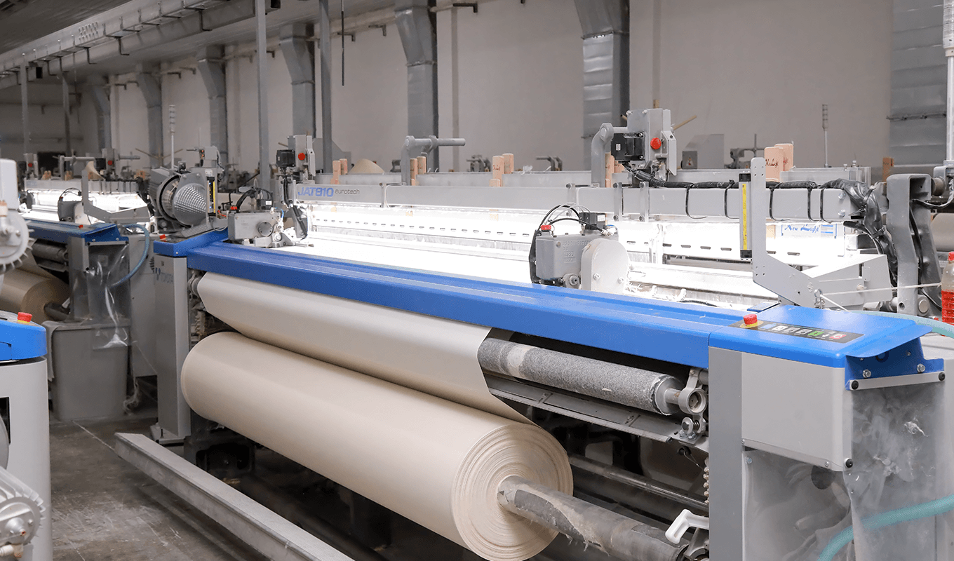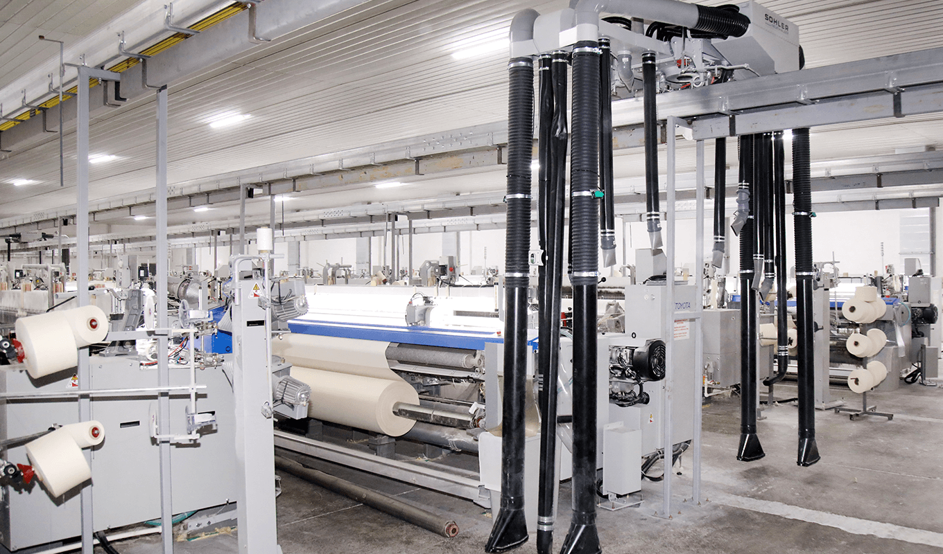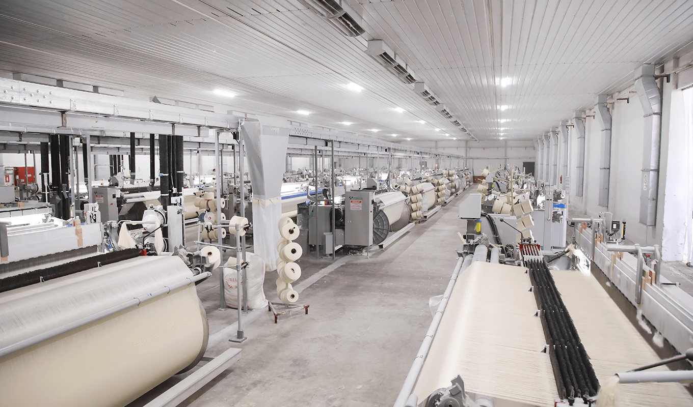35 unserer 94 Webmaschinen befinden sich in dieser Produktionslinie. Mit 35 Luftwebstühlen wird Rohgewebe in der gewünschten Größe, Art und Qualität produziert. Auf diesen werden durchschnittlich 15.000 Meter einer Gesamttagesproduktion von 40.000 Metern produziert Linie. Mit Klimaanlagen sind jederzeit angemessene Arbeitsbedingungen gegeben. Aufgrund der Bedeutung der Garnstärke wird der Innenraum ganzjährig auf 28 °C und einer Luftfeuchtigkeit von 70 % gehalten. Mobile Reinigungsgeräte halten die Produktion in einem jederzeit tadelloser Zustand.