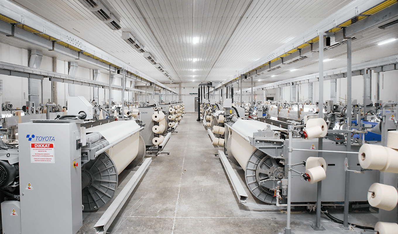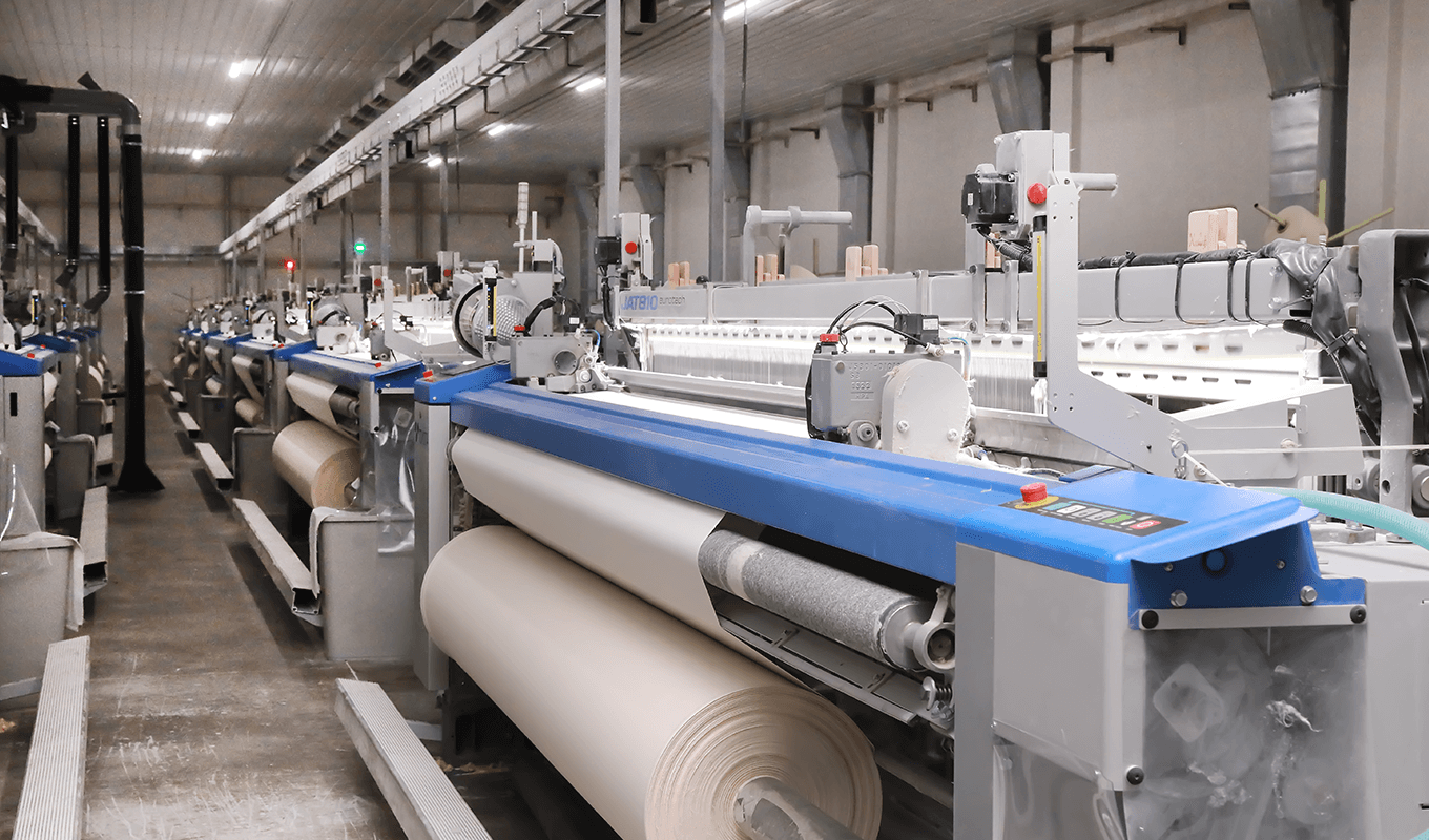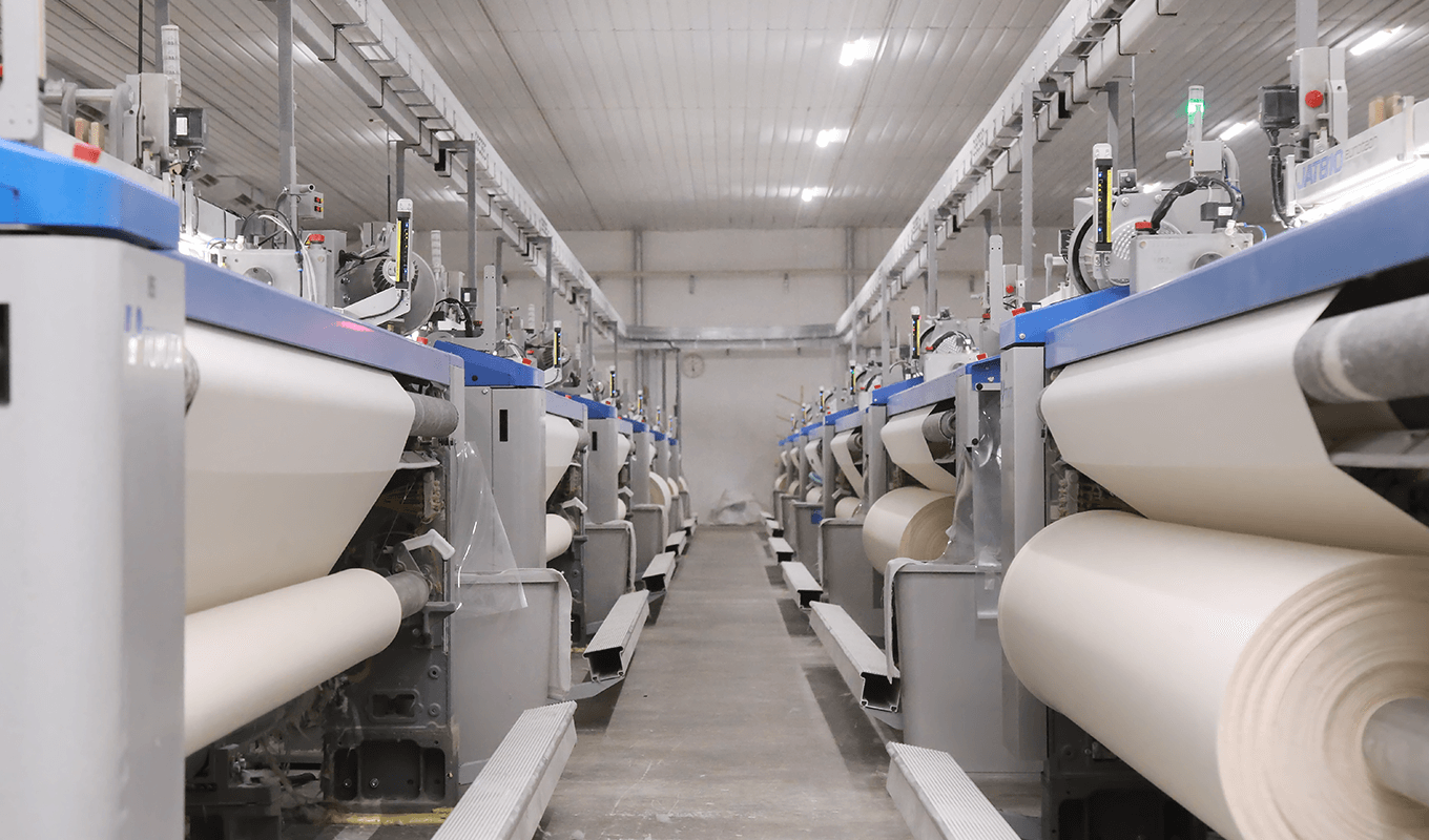 35 unserer 94 Webmaschinen befinden sich in dieser Produktionslinie. Mit 35 Luftwebstühlen wird Rohgewebe in der gewünschten Größe, Art und Qualität produziert. Auf diesen werden durchschnittlich 15.000 Meter einer Gesamttagesproduktion von 40.000 Metern produziert Linie. Mit Klimaanlagen sind jederzeit angemessene Arbeitsbedingungen gegeben. Aufgrund der Bedeutung der Garnstärke wird der Innenraum ganzjährig auf 28 °C und einer Luftfeuchtigkeit von 70 % gehalten. Mobile Reinigungsgeräte halten die Produktion in einem jederzeit tadelloser Zustand.